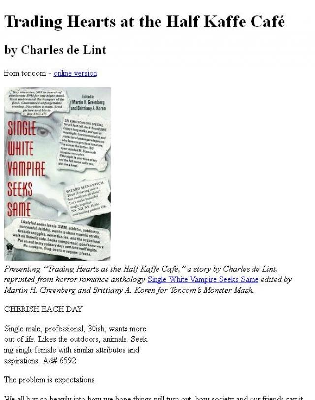 Presenting “Trading Hearts at the Half Kaffe Café,” a story by Charles de Lint, reprinted from horror romance anthology Single White Vampire Seeks Same edited by Martin H. Greenberg and Brittiany A. Koren for Tor.com’s Monster Mash. CHERISH EACH DAY