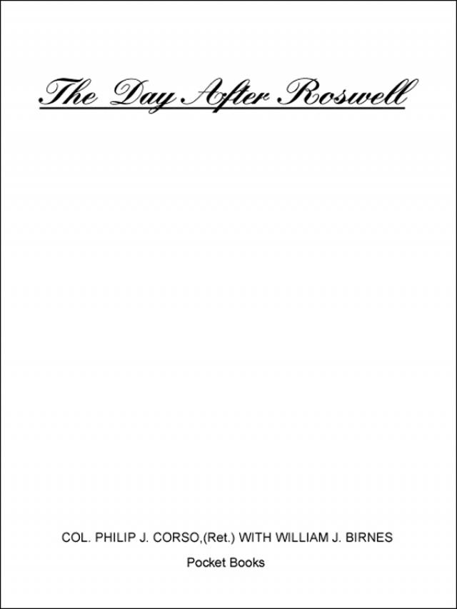 But hidden beneath everything I did, at the center of a double life I led that no one knew about, and buried deep inside my job at the Pentagon was a single file cabinet that I had inherited because of my intelligence background. That file held the army’s deepest and most closely guarded secret: the Roswell files, the cache of debris and information an army retrieval team from the 509th Army Air Field pulled out of the wreckage of a flying disk that had crashed outside the town of Roswell in the New Mexico desert in the early-morning darkness during the first week of July 1947. The Roswell file was the legacy of what happened in the hours and days after the crash when the official government cover-up was put into place. As the military tried to figure out what it was that had crashed, where it had come from, and what its inhabitants’ intentions were, a covert group was assembled under the leadership of the director of intelligence, Adm. Roscoe Hillenkoetter, to investigate the nature of the flying disks and collect all information about encounters with these phenomena while, at the same time, publicly and officially discounting the existence of all flying saucers. This operation has been going on, in one form or another, for fifty years amidst complete secrecy.